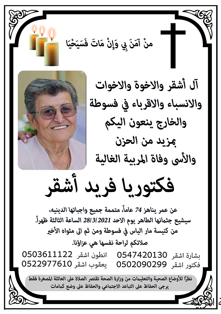 فسوطة-وفاة المربية فكتوريا فريد أشقر