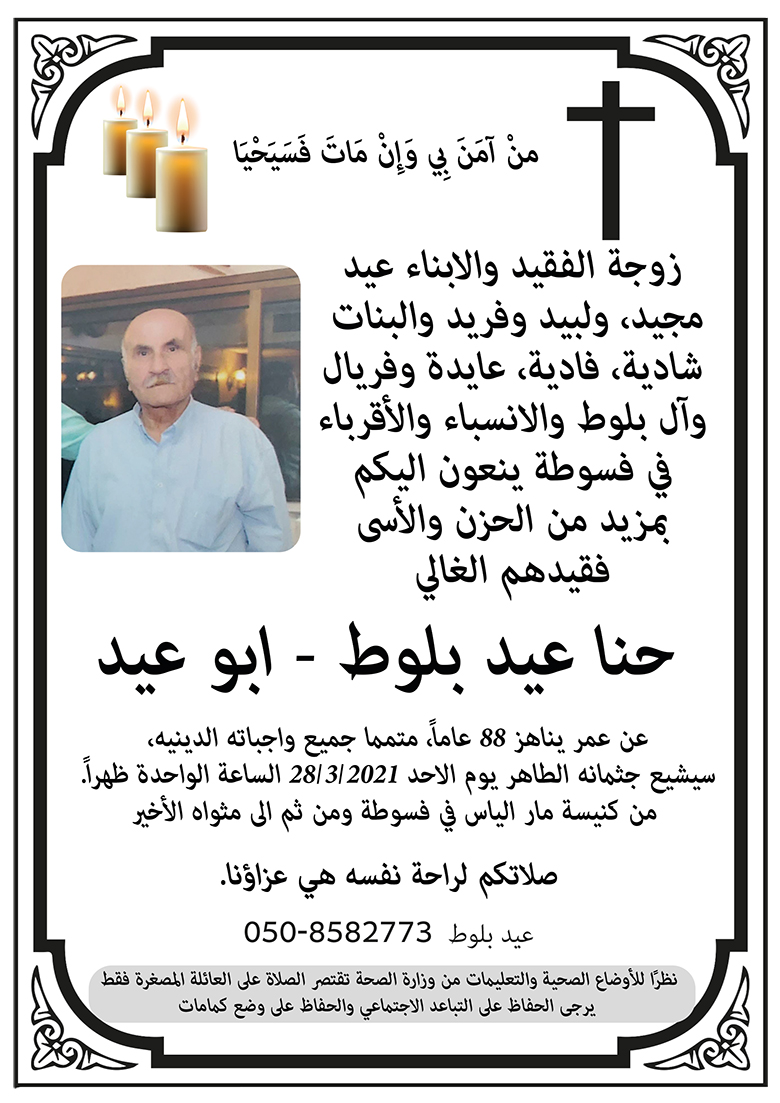 فسوطة: وفاة الفاضل حنا عيد بلوط ابو عيد