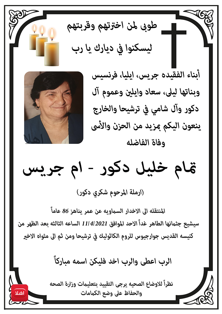 ترشيحا- وفاة الفاضلة تمام خليل دكور
