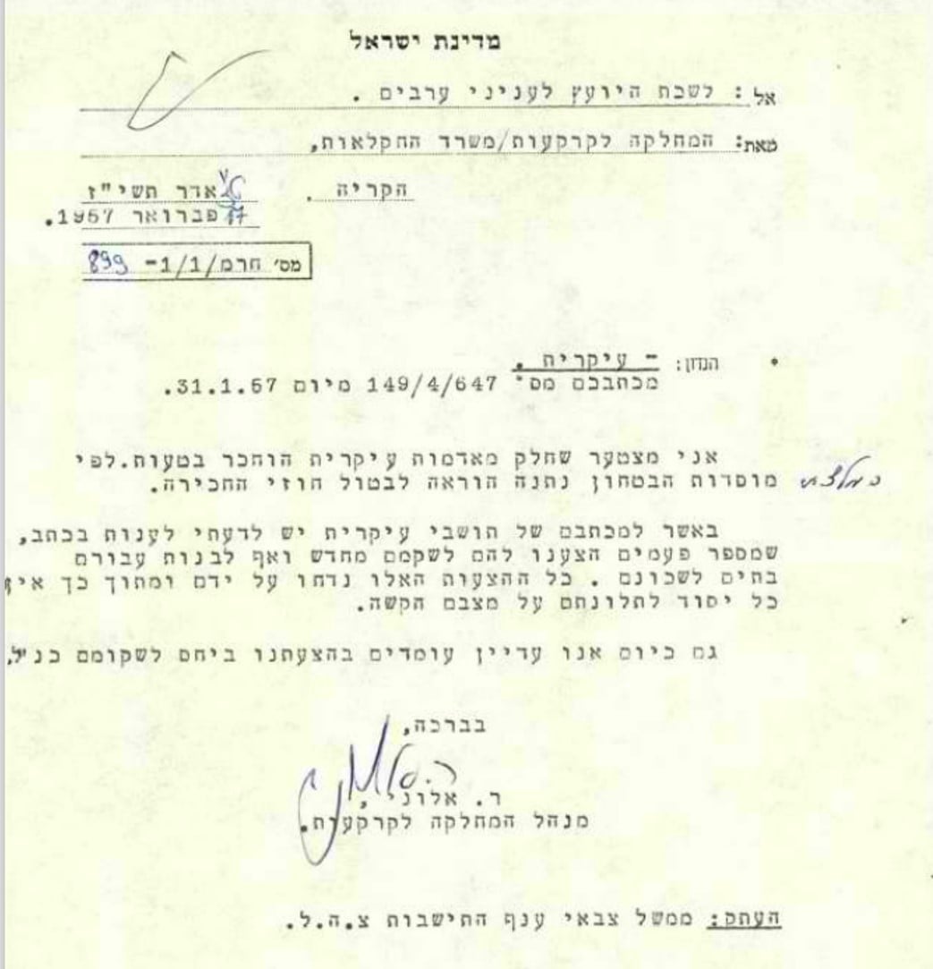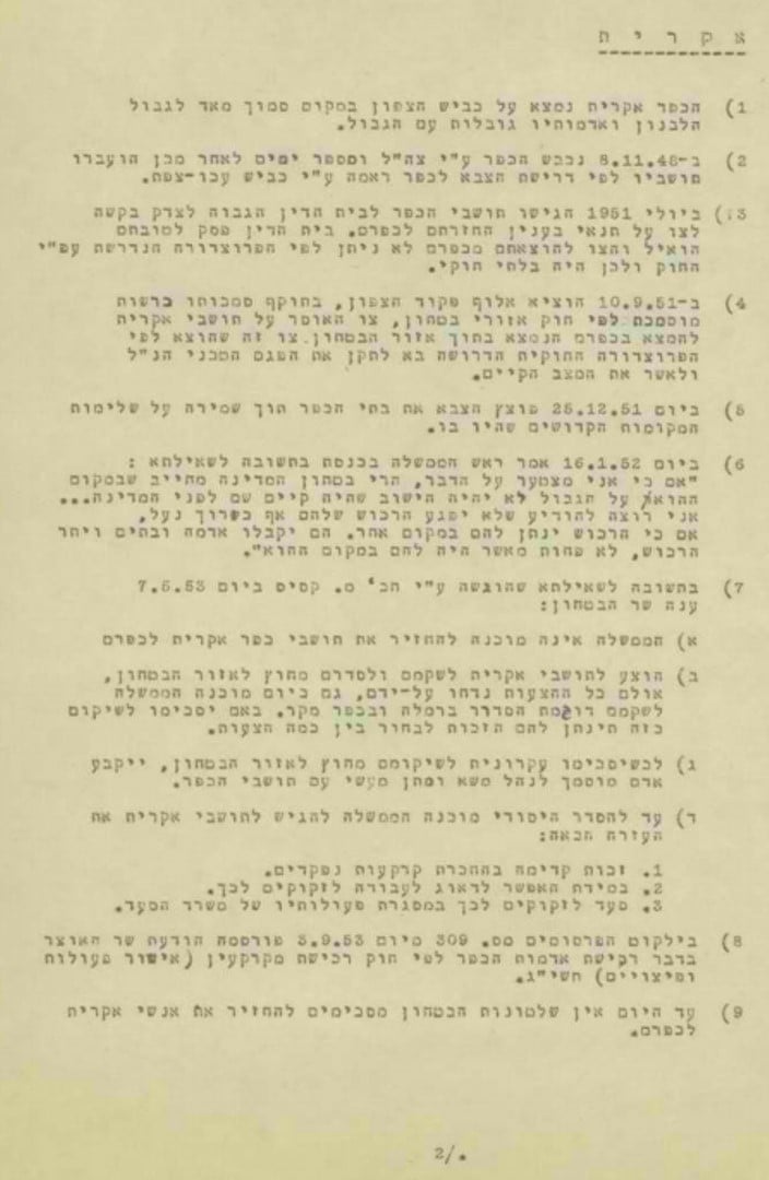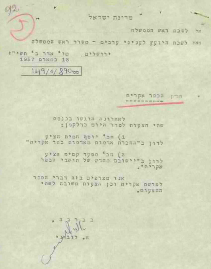 مستشار رئيس الحكومة لشؤون العرب، أوري لوبراني، يُقدم لرئيس الحكومة يوم 18.3.57 ملخص عن موضوع اقرث وتوصيات للرد على الاقتراحات.