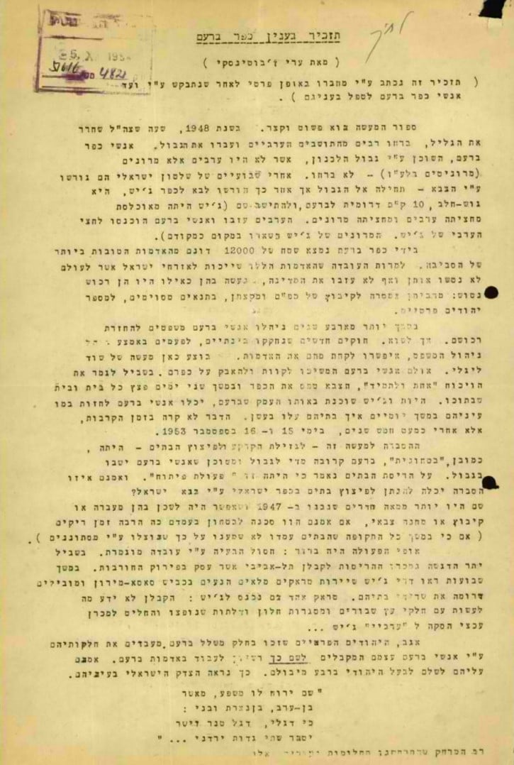 بعد تهجير قرية كفر برعم عام 48، قامت لجنة الأهالي بتجنيد عري جبوتنسكي عام 1954 لإعادة الأهالي لبيوتهم وبلدهم، ويعد ملخص لموضوع كفر برعم.