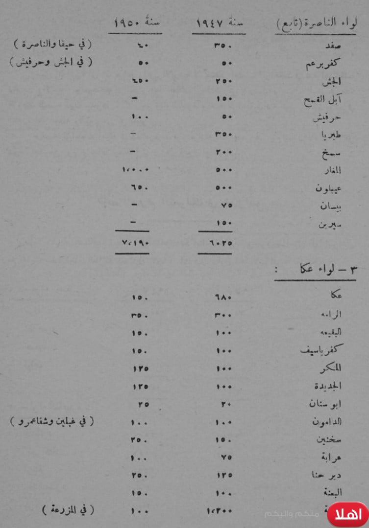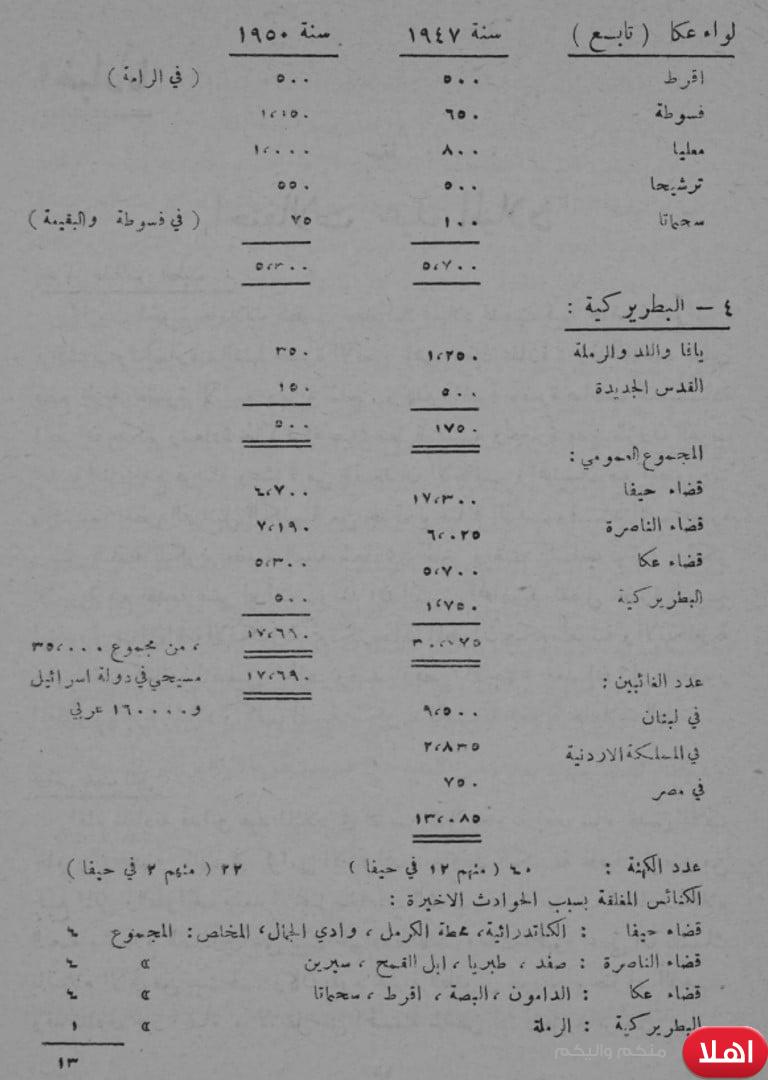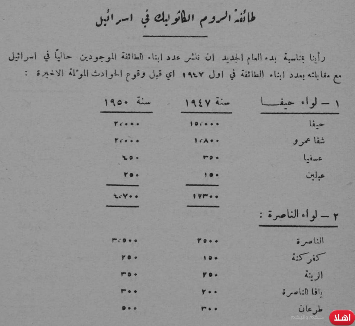 معطيات حول عدد المسيحيين من الروم الكاثوليك، بداية عام 47 (قبل النكبة)، مقارنة بعددهم بداية عام 1950.