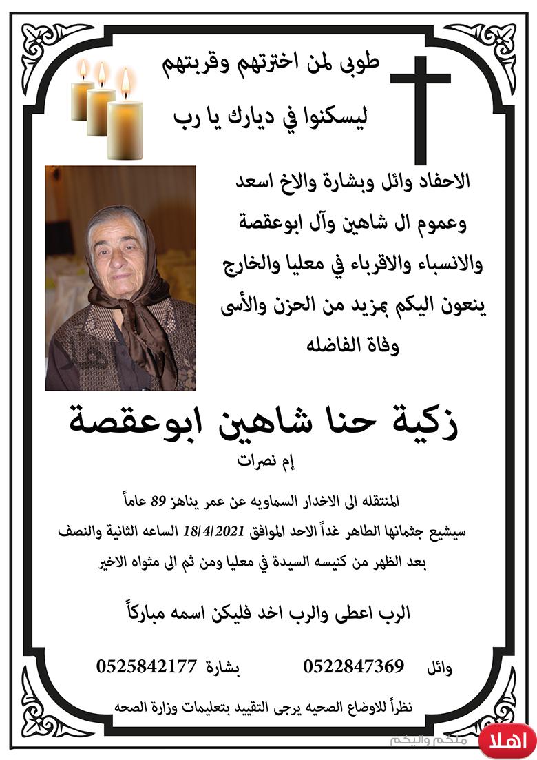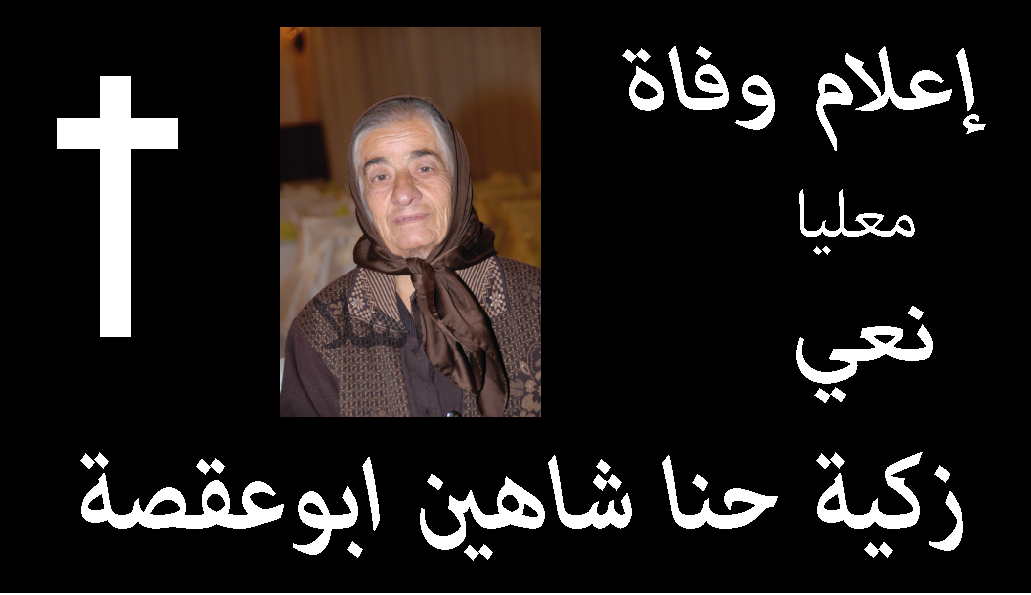 معليا - وفاة الفاضلة زكية حنا شاهين ابو عقصة ام نصرات
