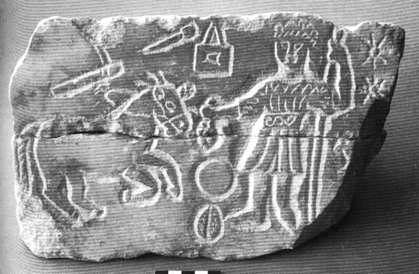 فإلى يميننا في الحفر ثمة نجمتان. ونحن نفترض أنه كانت هناك نجمة ثالثة، لكنها اختفت مع الكسر الواضح أسفلهما. النجوم الثلاثة تمثل، في اعتقادنا، نجوم حزام الجوزاء (الجبار): النطاق، النيلام، المنطقة.