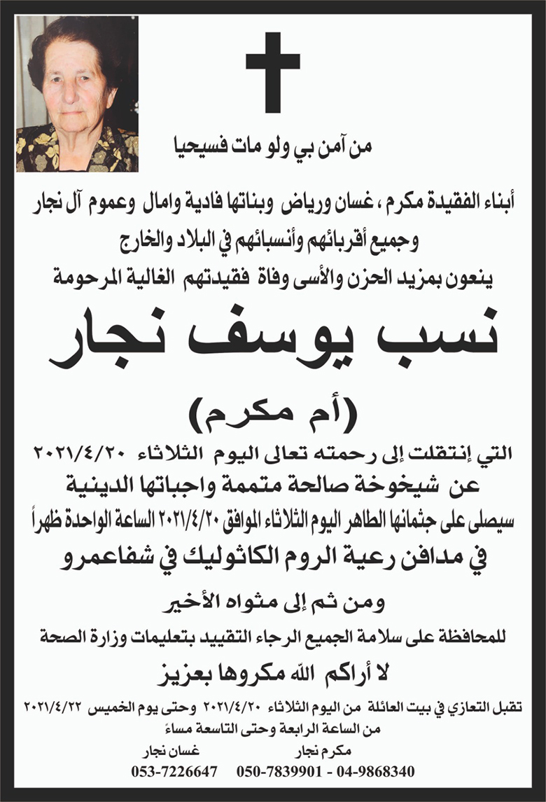 شفاعمرو- وفاة الفاضلة نسب يوسف نجار ام مكرم