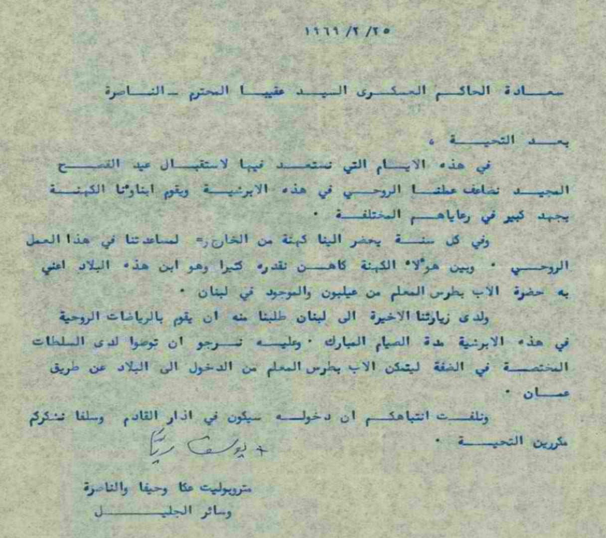 المطران يوسف ريا يتوجه يوم 25.2.69 للحاكم العسكري في الناصرة يطلب منه السماح للأب بطرس (بيير) المعلم والمتواجد في لبنان، بالحضور للبلاد عبر الأردن في آذار المقبل.