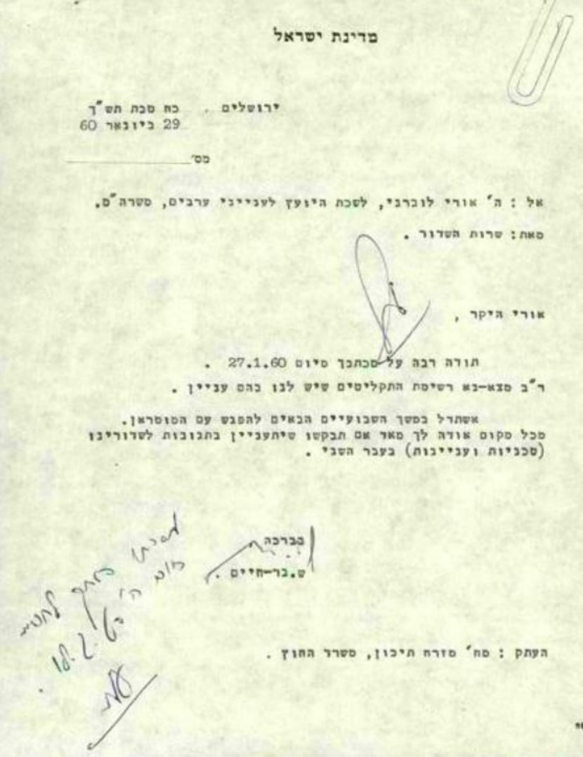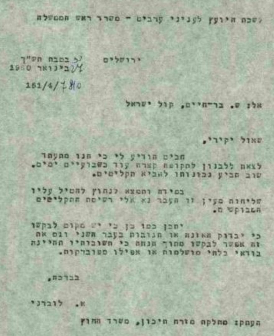 يوم 27.1.60 يكتب المستشار لوبراني لمدير "صوت إسرائيل" بار-حاييم بأن المطران سيتوجه إلى لبنان بعد أسبوعين، وان المطران قد اعرب عن استعداده "ثانية" لجلب أسطوانات أغاني، في حال رغبتك بأسطوانات إضافية، عليك تحويل القائمة بواسطتي.