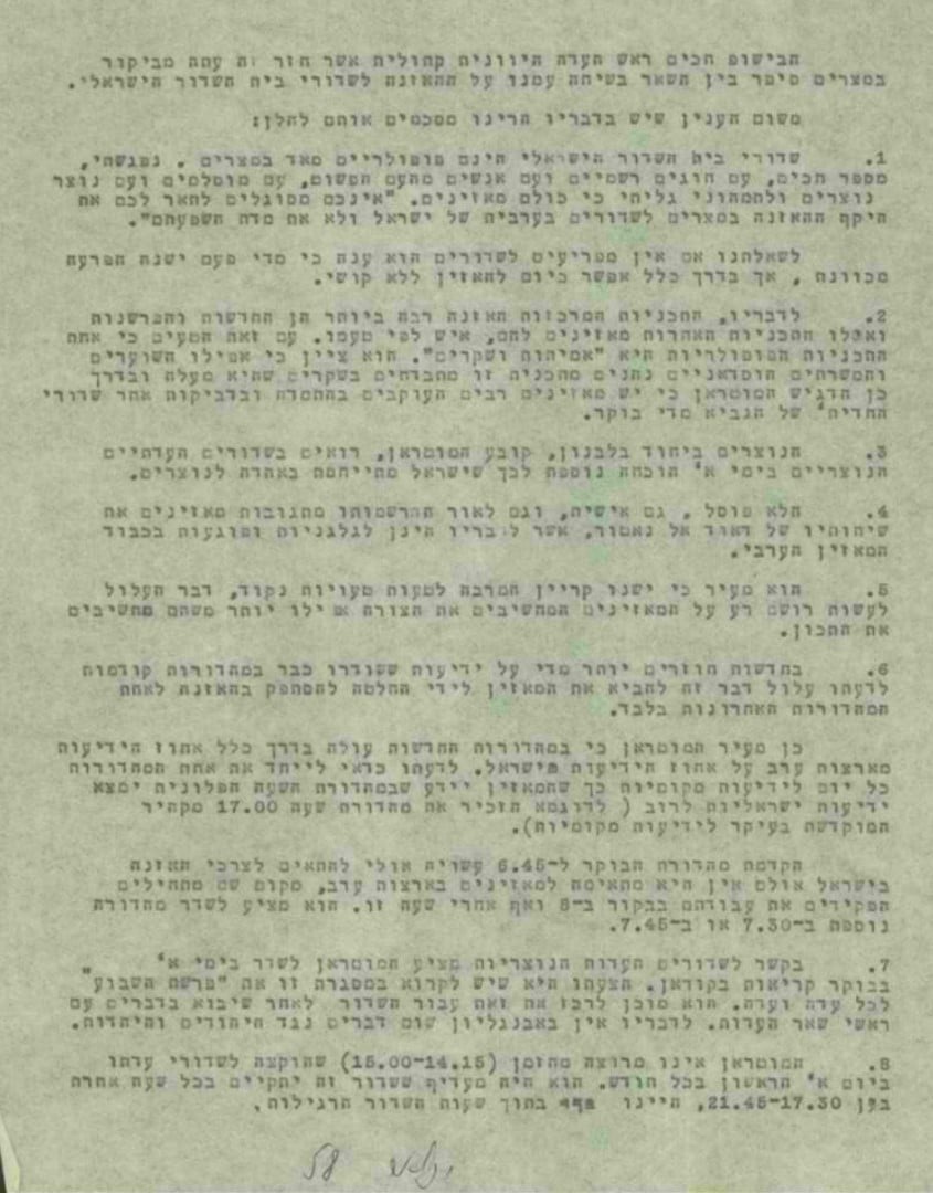 بار حاييم يرفق قائمة مطولة لأغاني بحاجة اليها صوت إسرائيل (أغاني لأم كلثوم، فريد الأطرش، عبد الوهاب وعبدالحليم حافظ، وليس لأغاني فيروز الوطنية)، ويطلب من المطران تقديم تقرير عن مدى الاستماع لصوت إسرائيل في لبنان وسوريا.