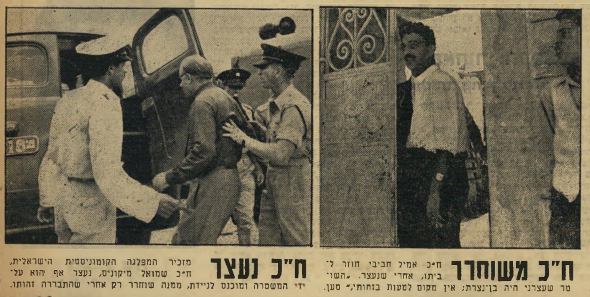 عشية عيد العمال، يتم اقتحام نادي الحزب في الناصرة واعتقال عضو الكنيست أميل حبيبي والعديد من الرفاق. كما ويتم اعتقال توفيق طوبي وإعادته إلى حيفا بالرغم من حصوله على تصريح للتواجد في الناصرة حتى الأول من أيار.