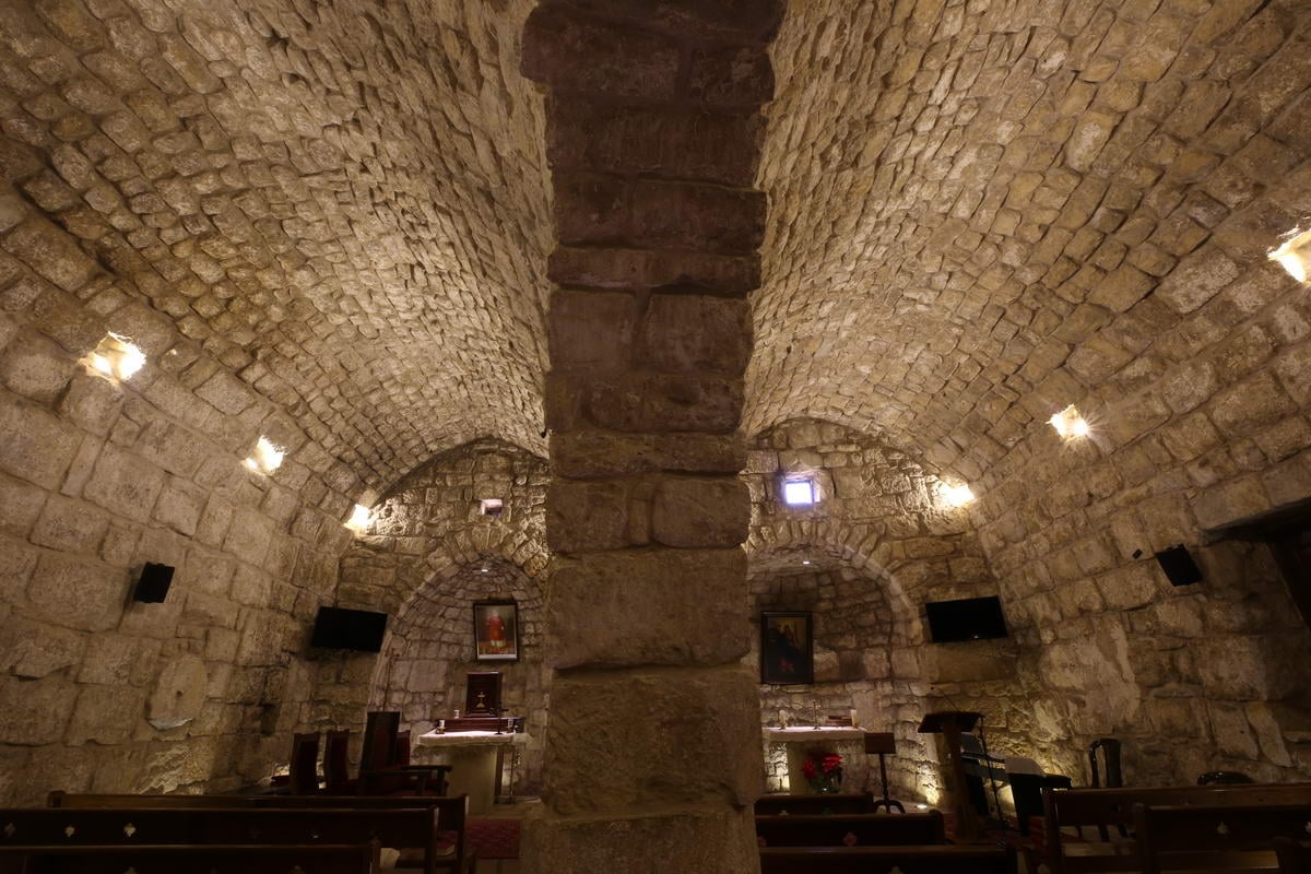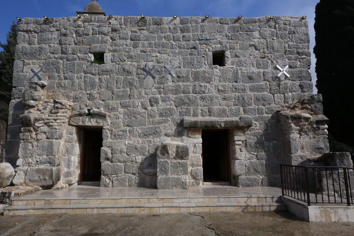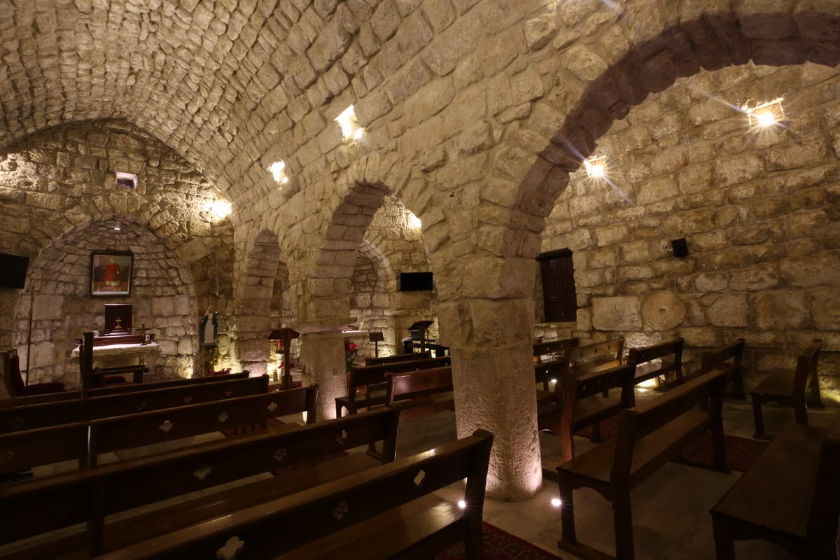 بالنسبة الى تلك الكنيسة فلا يمكن حالّياً تحديد زمن تحوُّلها من هيكلٍ وثنيّ الى كنيسة، انما نستطيع ان نردّ هذه المرحلة تقريبياً الى العهد البيزنطي.. استناداً الى طريقة تنسيق الفسيفساء التي وُجدت في أرضها. وقد بقي من آثار الهيكل الوثنيّ أعمدة ذات أطنافٍ من الطراز الأيوني والدُوري قائمة داخلَ الكنيسة وخارجَها. وقد وُجد في هذه الكنيسة احد الكتب البيعية الذي كُتب على هامشه ان البطريرك دانيال الشاماتي(1230-1239) قد كرَّس هذه الكنيسة، وحفر رسم الصليب على احد حجارتها الكائن في الحائط القبليّ منها تذكاراً لهذا التكريس، وهذا الرسم عثر عليه العمّال بينما كانوا يقشرون طبقات الطين عن وجه الحائط المذكور.