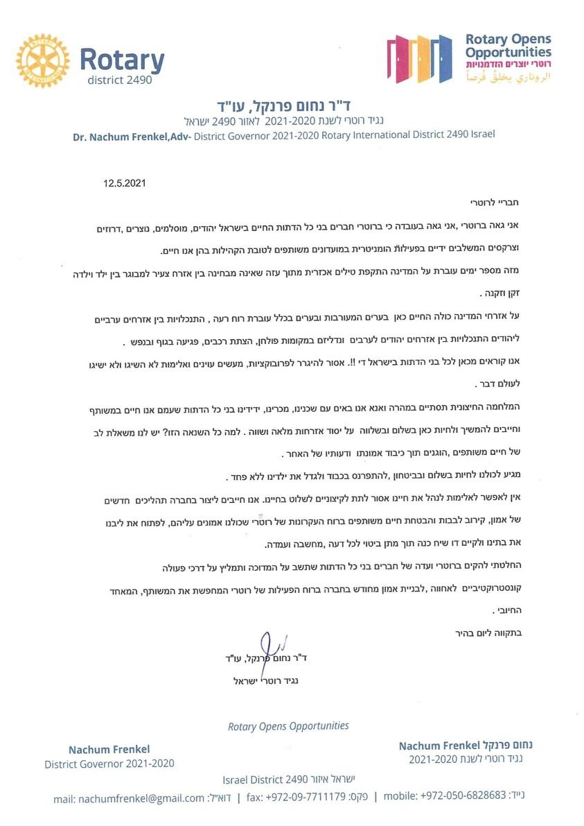 اهلا في بيان رسمي مرفق وصل الى الموقع من الرئيس الاداري لنادي روتاري في البلاد تنديدا ومطالبه لوقف اعمال العنف والشغب في البلا دالامر الذي يطال كل بيت وكل عائلة البيان باللغه العبرية كما وصل الى الموقع חבריי לרוטרי אני גאה ברוטרי ,אני גאה בעובדה כי ברוטרי חברים בני כל הדתות החיים בישראל יהודים, מוסלמים, נוצרים ,דרוזים וצרקסים המשלבים ידיים בפעילות הומניטרית במועדונים משותפים לטובת הקהילות בהן אנו חיים. מזה מספר ימים עוברת על המדינה התקפת טילים אכזרית מתוך עזה שאינה מבחינה בין אזרח צעיר למבוגר בין ילד וילדה זקן וזקנה . על אזרחי המדינה כולה החיים כאן בערים המעורבות ובערים בכלל עוברת רוח רעה , התנכלויות בין אזרחים ערביים ליהודים התנכלויות בין אזרחים יהודים לערבים ונדליזם במקומות פולחן, הצתת רכבים, פגיעה בגוף ובנפש . אנו קוראים מכאן לכל בני הדתות בישראל די !!. אסור להיגרר לפרובוקציות, מעשים עוינים ואלימות לא השיגו ולא ישיגו לעולם דבר . המלחמה החיצונית תסתיים במהרה ואנא אנו באים עם שכנינו, מכרינו, ידידינו בני כל הדתות שעמם אנו חיים במשותף וחייבים להמשיך ולחיות כאן בשלום ובשלווה על יסוד אזרחות מלאה ושווה . למה כל השנאה הזו? יש לנו משאלת לב של חיים משותפים ,הוגנים תוך כיבוד אמונתו ודעותיו של האחר . מגיע לכולנו לחיות בשלום ובביטחון ,להתפרנס בכבוד ולגדל את ילדינו ללא פחד . אין לאפשר לאלימות לנהל את חיינו אסור לתת לקיצוניים לשלוט בחיינו. אנו חייבים ליצור בחברה תהליכים חדשים של אמון, קירוב לבבות והבטחת חיים משותפים ברוח העקרונות של רוטרי שכולנו אמונים עליהם, לפתוח את ליבנו את בתינו ולקיים דו שיח כנה תוך מתן ביטוי לכל דעה ,מחשבה ועמדה. החלטתי להקים ברוטרי ועדה של חברים בני כל הדתות שתשב על המדוכה ותמליץ על דרכי פעולה קונסטרוקטיביים לאחווה ,לבניית אמון מחודש בחברה ברוח הפעילות של רוטרי המחפשת את המשותף, המאחד החיובי . חג שמח לכבוד עיד אל פיטר וחג השבועות. בתקווה ליום בהיר ד"ר נחום פרנקל, עו"ד נגיד רוטרי ישראל