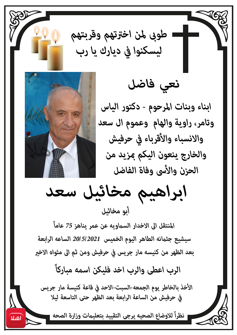 حرفيش: وفاة الفاضل ابراهيم مخائيل سعد عن عمر ٧٥ عام