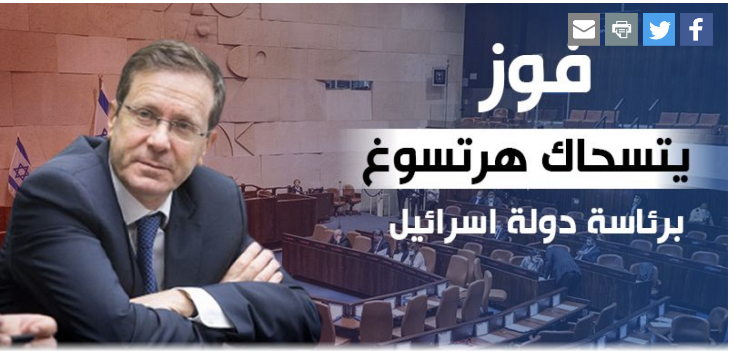 اهلا- الصورة موقع بكرا بعد ترشحه لرئاسة دولة اسرائيل أُعلن قبل قليل عن فوز "يتسحاك هرتسوغ" برئاسة دولة اسرائيل، خلفًا لرؤوفين رفلين. وقد التأمت الكنيست في الحادية عشرة من قبل ظهر اليوم لانتخاب الرئيس الحادي عشر لدولة إسرائيل خلفا لرؤوفين ريفلين. وتنافس على المنصب رئيس الوكالة اليهودية يتسحاق هرتصوغ والناشطة الاجتماعية المربية مريام بيرتس التي ثكلت اثنين من أبنائها خلال الخدمة العسكرية .
