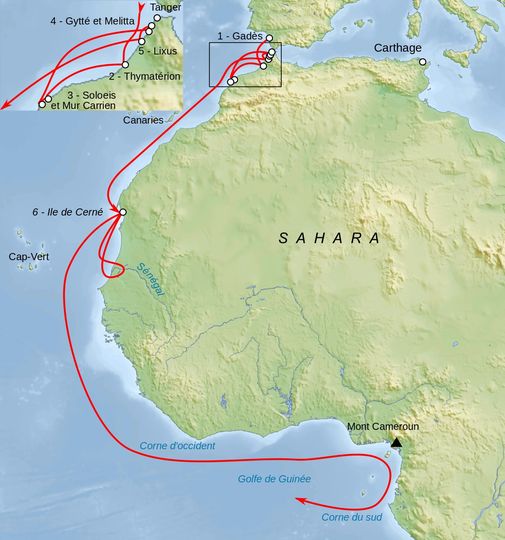 انطلقت الرحلة من مدينة قرطاج في حوالي القرن الخامس قبل الميلاد، ووصلت أخبارها عن طريق ترجمتها الإغريقية، وقد اشترك في هذه الرحلة الليبيون إلى جانب القرطاجيين، ويلاحظ بأن الرحلة لم تشير إلى أنّها سلكت شواطئ بلاد المغرب، أو شواطئ جنوب غربي أوروبا فيما عدا ذكرها لاجتياز «أعمدة هرقل» التي هي مضيق جبل طارق الحالي ..