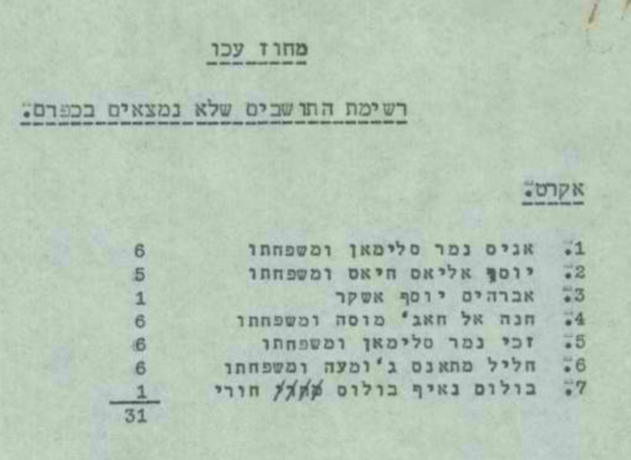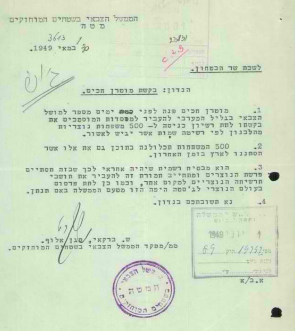 مرفق رسالة من القائم بأعمال الحاكم العسكري لوزير الدفاع (بن غوريون) من يوم 30.5.1949 يعرض فيها توجه المطران حكيم لمؤسسات الدولة للحصول على موافقة دخول ل 500 عائلة مسيحية من لبنان مقابل: