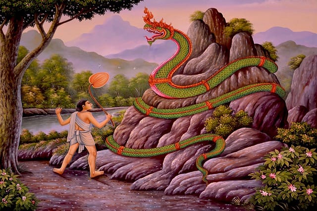 _أجابته الأفعی: «حسنا، من الجيد لك أن تتكلم ولكن هذه ليست الطريقة التي يسير بها العالم، بل إن الأفعال الصالحة تكافأ بالشر؟»