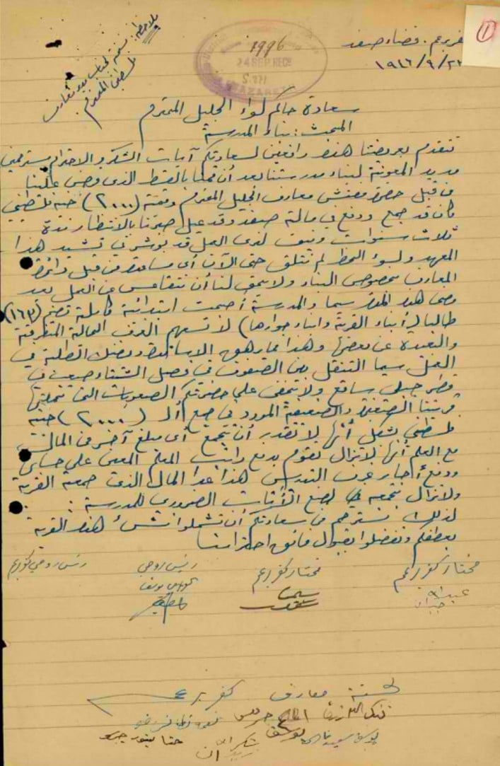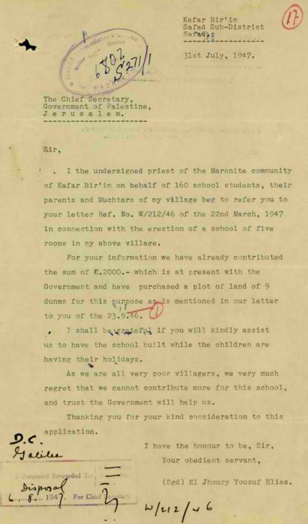 مخاتير، خوارنة ولجنة المعارف في كفر برعم، تتوجه يوم 23.9.46 الى حاكم لواء الجليل بتقديم الدعم لبناء مدرسة القرية.