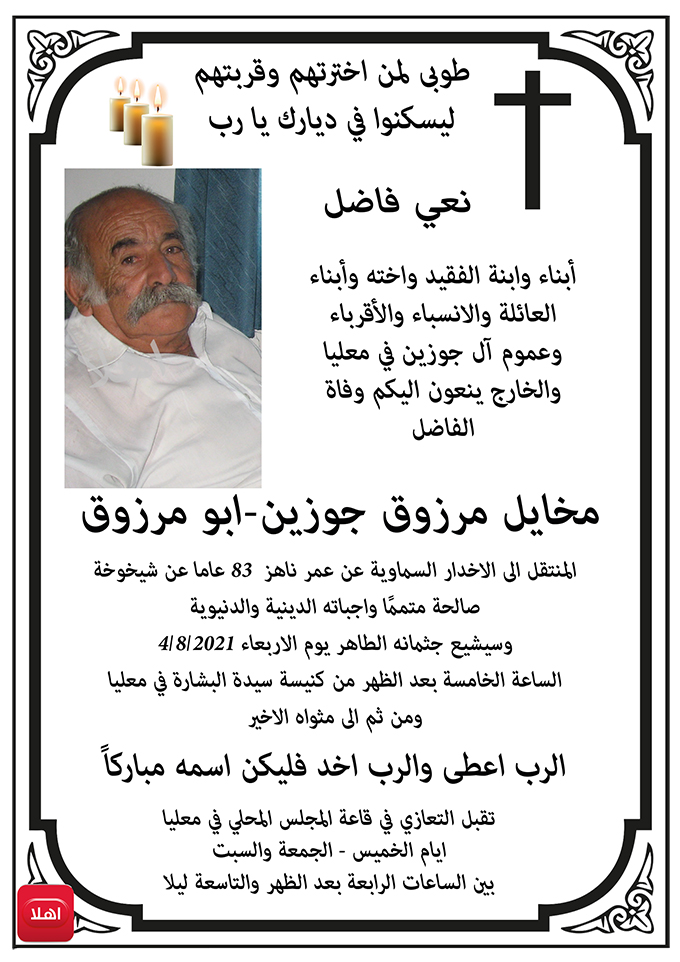 معليا- وفاة الفاضل مخايل مرزوق جوزين ابو مرزوق عن عمر ٨٣ سنة