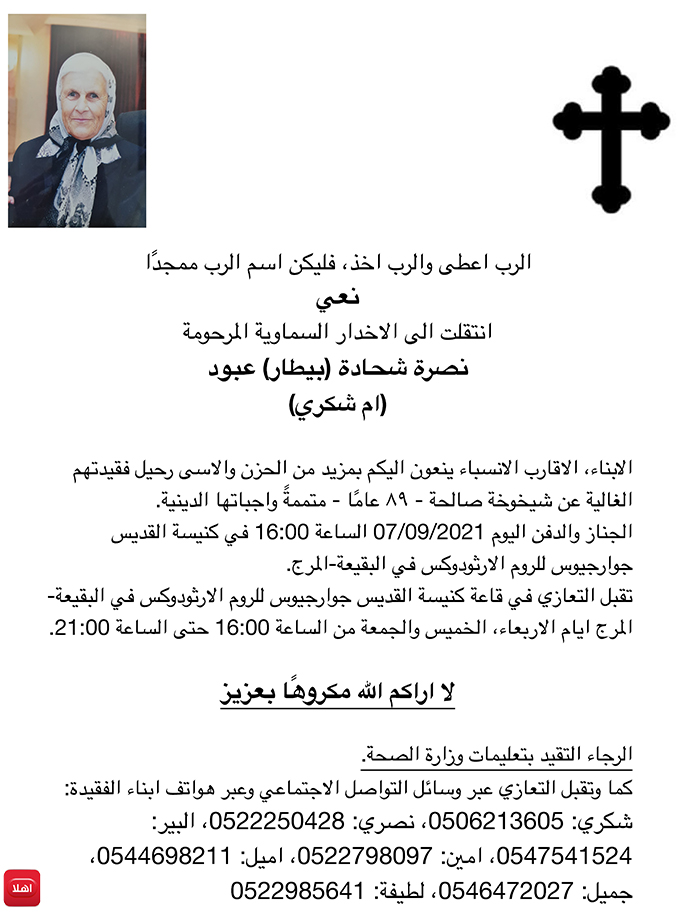 البقيعه-المرج: وفاة الفاضلة نصرة شحادة عبود-ام شكري