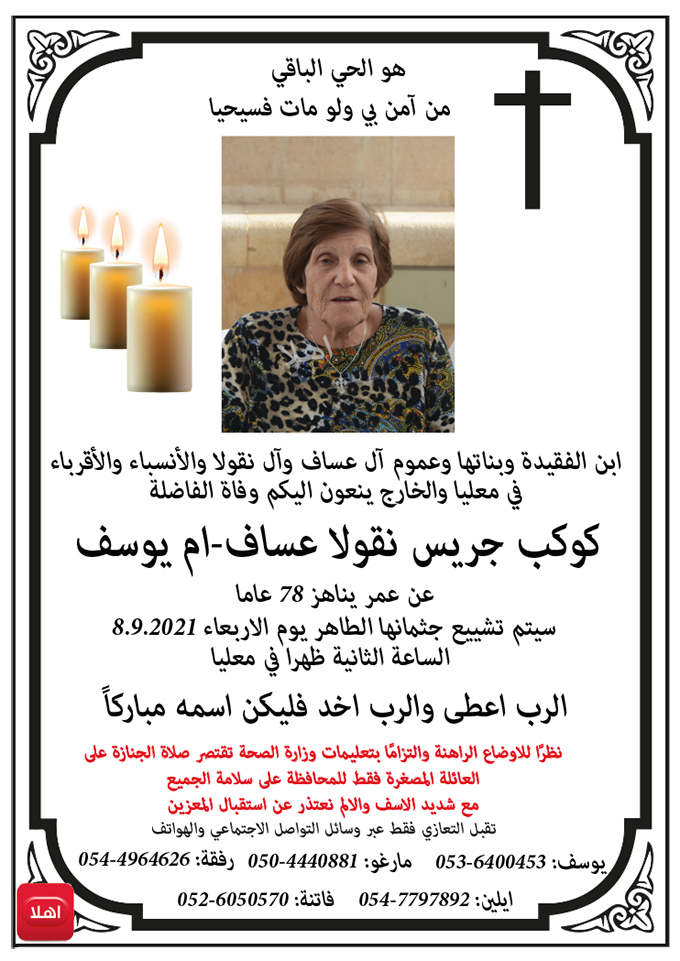 معليا: وفاة الفاضلة كوكب جريس عساف ام يوسف