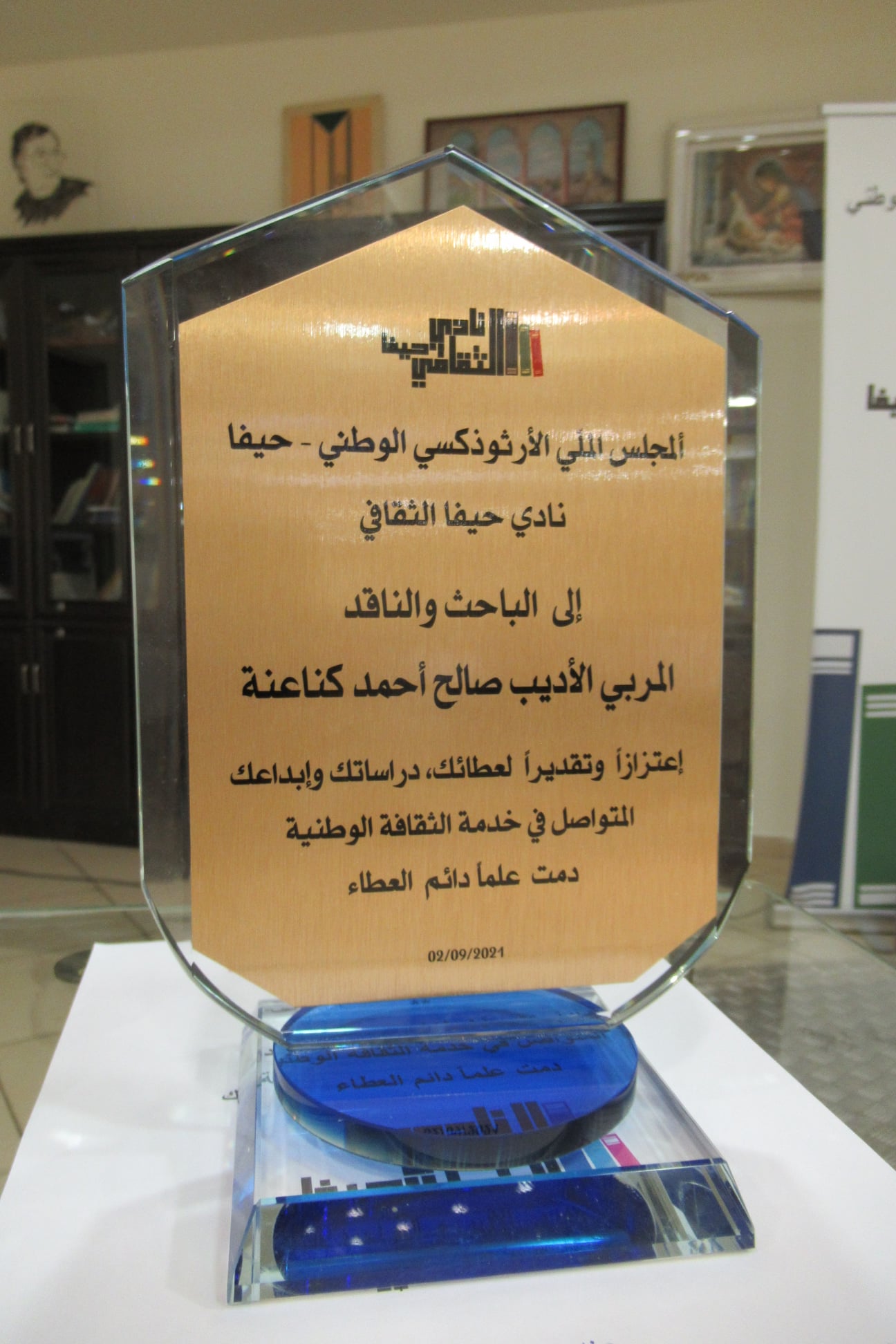 أقام نادي حيفا الثقافي يوم الخميس 02.09.2021 أمسية تكريم للأديب والمربي صالح أحمد كناعنة، ابن بلدة عرابة البطوف الجليلية، وقد حضر الأمسية - إلى جانب أفراد عائلة المُكرَّم - كوكبة من الأدباء وأصحاب القلم والأصدقاء من حيفا وشتى البلدات العربية للمشاركة في هذا التكريم.