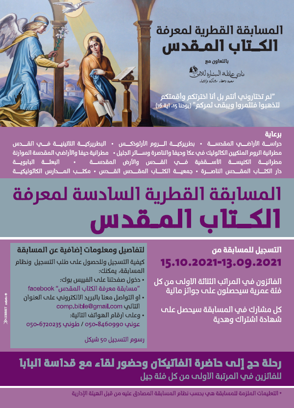 اهلا فتح باب التسجيل للمسابقة القطرية السادسة لمعرفة الكتاب المقدس تهدف المسابقة الى تشجيع الانتماء المسيحي لدى ابناء الرعايا المسيحية، وحثهم على تعميق الفكر الديني الايجابي النابع من محبة الآخرين، وتعزيز التآخي بين الأديان وتنمية الشعور بالانتماء لدى شبيبة الأراضي المقدسة للكنيسة ولأرض الكتاب المقدس. وقد قامت الهيئة الادارية للمسابقة منذ سنة 2012 بتنظيم خمسة مسابقات، ثلاثة منها لأجيال 10-35 ومسابقتين لأجيال 35 فما فوق، وقد حظي الفائزون في المرتبة الأولى من كل فئة عمرية بزيارة حج إلى حاضرة الفاتيكان وحضور لقاء مع قداسة البابا وزيارة لغبطة البطريرك المسكوني الارثوذكسي في القسطنطينية – اسطنبول بتمويل كامل من المسابقة. شهدت المسابقات اهتماماً كبيراً وتغطية إعلامية في وسائل الإعلام المختلفة، فبالإضافة إلى نقل أخبارها بشكل أسبوعي في الصحف ومواقع الانترنت وصفحات الفيسبوك، قامت قنوات التيلي باتشي الايطالية، وقناة أخبار الأرض المقدسة وقناة مساواه بتخصيص جزء من نشراتها الإخبارية للمسابقة، ونقلت أخباره المسابقة في عدة لقاءات، وقامت قنوات نورسات والمحبة اللبنانية بعرض كل أمسيات المسابقة على شاشاتها. يشرف على تنظيم المسابقة طاقم كبير من المتطوعين يعملون بهيئات متعددة، منها الهيئة الإدارية، الهيئة التنفيذية والهيئة المهنية المكونة من الآباء الأجلاء، الراهبات وعلمانيين من مختلف الرعايا، والتي ستقوم بوضع الأسئلة للمتسابقين وملائمتها بحسب أجيالهم. ينتهي التسجيل للمسابقة في 15.10.2021، وسيتم افتتاحها رسمياً في 5.11.2021 حيث ستستمر على مدى 18 امسية في كل يوم جمعة واختتامها في عيد البشارة 25.3.2022، حيث سيحصل الفائزون في المرتبة الأولى على رحلة حج لحاضرة الفاتيكان ولقاء قداسة البابا فرنسيس، أما الفائزون في واحد من الأماكن الثلاثة الأولى فسيحصلون أيضا على جائزة مالية، كما وسيحصل كل مشترك في المسابقة على شهادة اشتراك وهدية رمزية. الهيئة الإدارية للمسابقة تدعوا كافة الكنائس والمدارس والمؤسسات والعائلات إلى تشجيع طلابهم وأبنائهم على المشاركة في هذا الحدث المميز.