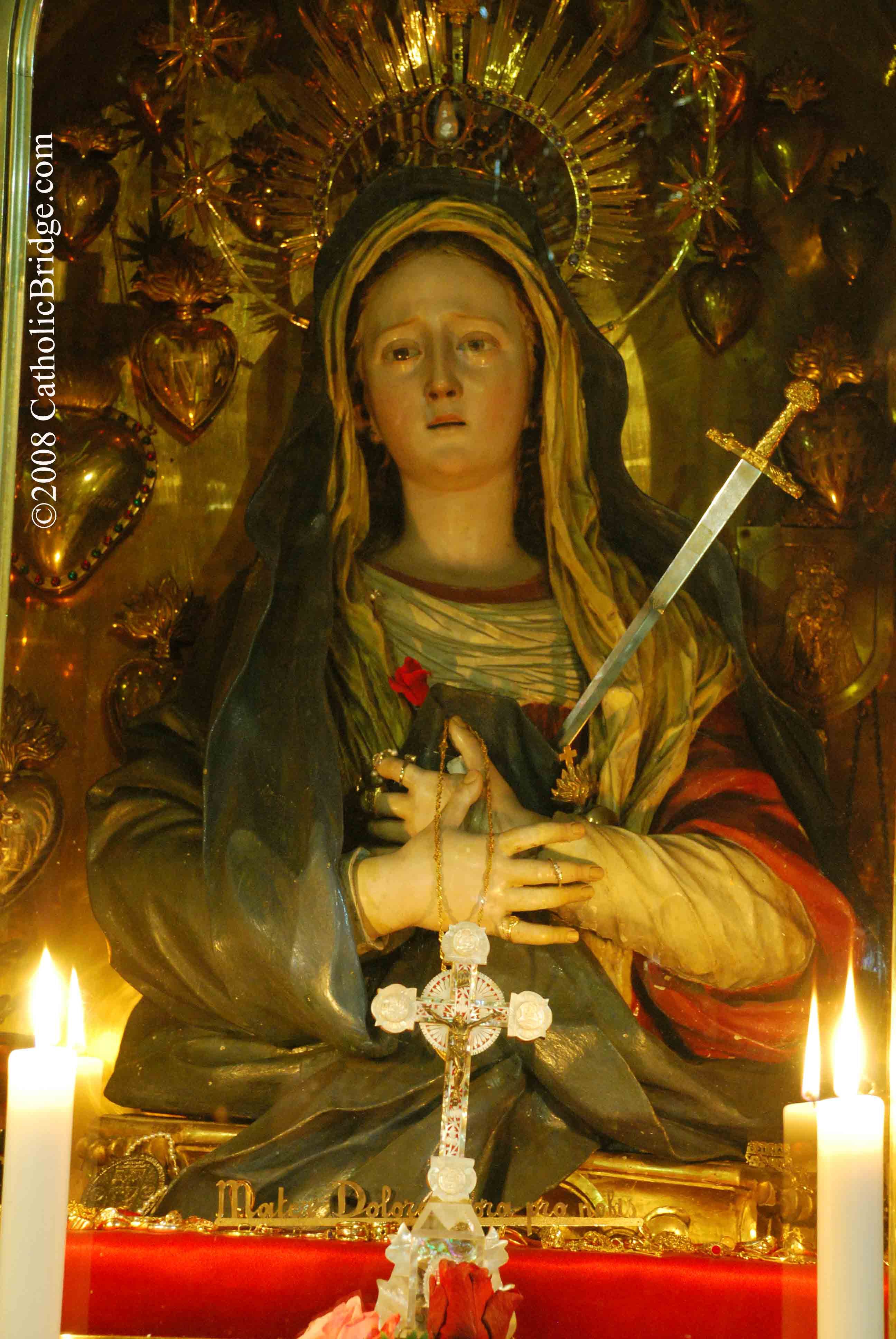 وفي بعض الكنائس الأخرى نجد تماثيل للسيدة العذراء مغروزا فيها سبعة سيوف نسبة للالام السبعة الرئيسية في حياة العذراء (نبوءة سمعان الشيخ، السفر الى مصر وما رافقه من عناء، فقدان يسوع في الهيكل وما رافقه من قلق، لقاء مريم بيسوع على طريق الالام وما رافق ذلك من حزن لألم ابنها، وموت يسوع على الصليب الذي مزق احشاء أمه من شدة الحزن، وتسلم جسد يسوع الميت وما رافقه من أسى عند مريم، ووضع يسوع في القبر وما رافقه من حزن لا يوصف لأم فقدت وحيدها).
