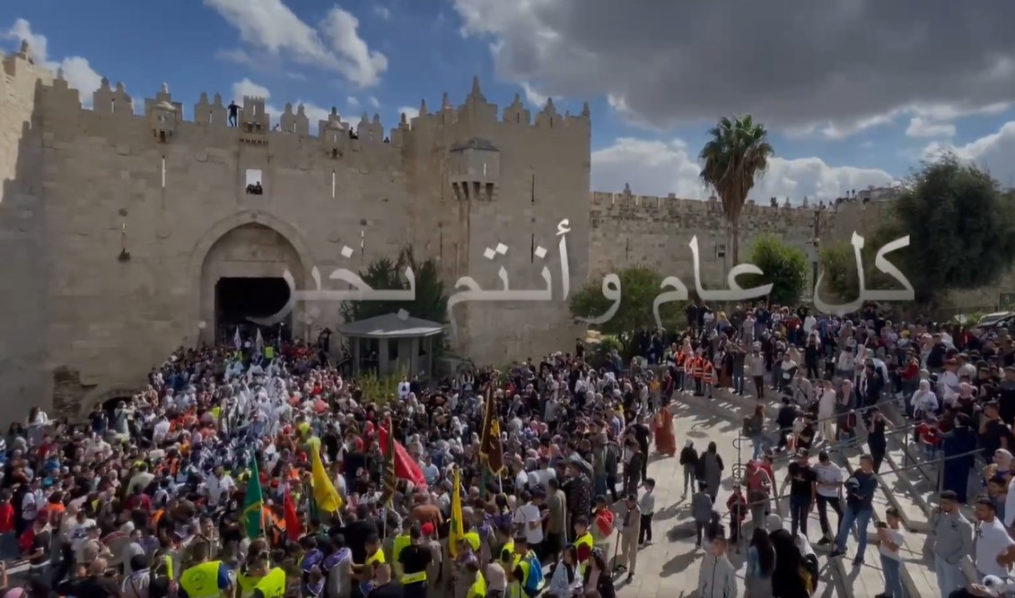 وصدحت مآذن الأقصى بأناشيد خاصة بالمناسبة، خلال الاحتفالات، كما وزعت الحلوى، وأقامت تلك الحشود صلاة الظهر جماعة في المسجد الأقصى.