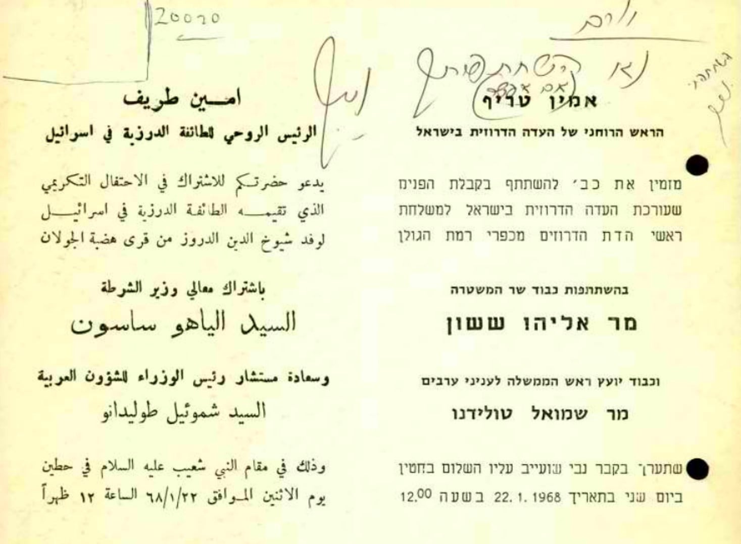 في السنة التالية لحرب 67، يقوم الشيخ أمين طريف بدعوة شخصيات عربية ويهودية الى مقام النبي شعيب عليه السلام لحفل استقبال وفد شيوخ الدين الدروز من قرى هضبة الجولان، باشتراك وزير الشرطة ومستشار رئيس الوزراء للشؤون العربية.
