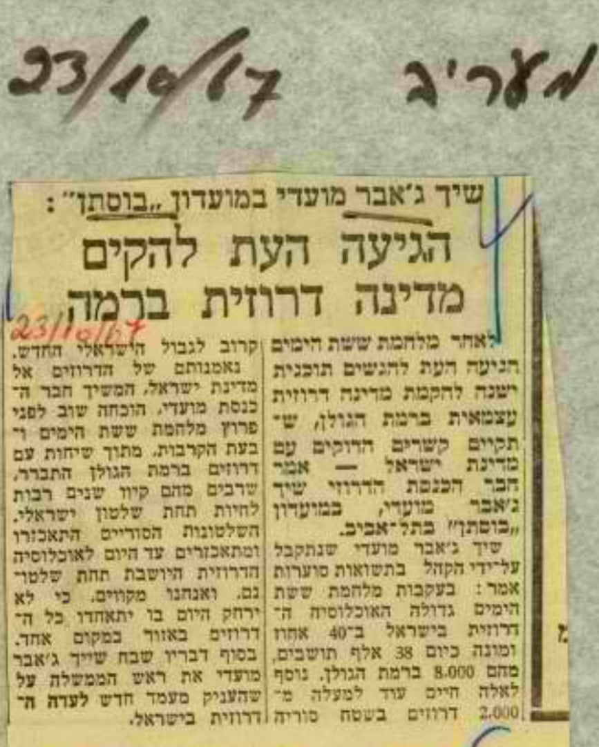 مع توقف المدافع في هضبة الجولان وانتهاء حرب الأيام الستة، يستضيف نادي (بستان) في تل أبيب عضو الكنيست جبر داهش معدي.