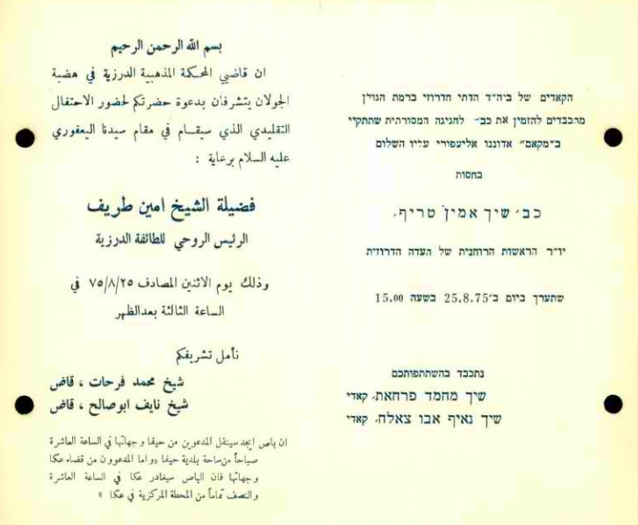 وفي عام 1975، يقوم قضاة الطائفة في هضبة الجولان بدعوة شخصيات مختلفة لمقام اليعفوري عليه السلام، بمشاركة وزير الأديان والشيخ طريف.