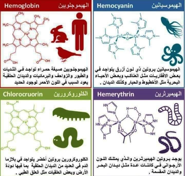 3 - ﺍﻟﻠﻮﻥ الأخضر ﻟﺪﻡ ﺑﻌﺾ ﺍﻟﻌﻮﺍﻟﻖ ﻭ ﺍﻟﺪﻳﺪﺍﻥ ﺑﺴﺒﺐ ﻣﺮﻛﺐ ﺍﻟﻜﻠﻮﺭﻛﺮﻭﺭﻳﻦ ﻭ ﺍﻟﺬﻱ ﻳُﺸﺎﺑﻪ ﺗﺮﻛﻴﺐ الهيموغلوبين و ﻟﻜﻦ ﻳﺨﺘﻠﻒ ﻋﻨﻪ ﺑﻮﺟﻮﺩ ﻣﺠﻤﻮﻋﺔ ﺃﻟﺪﻳﻬﺎﻳﺪ ﺑﺪﻻً ﻣﻦ ﻣﺠﻤﻮﻋﺔ ﺍﻟﻔﻨﻴﻞ