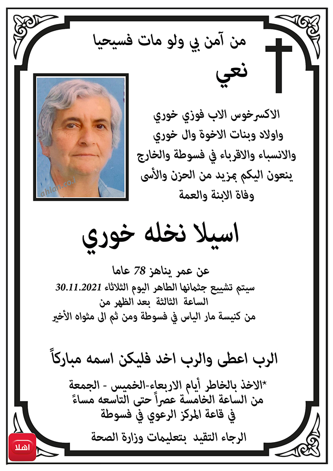 فسوطة: نعي وفاة الفاضلة اسيلا نخلة خوري