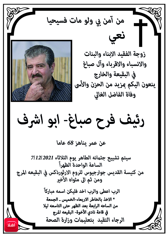 البقيعة: وفاة المرحرم رئيف فرح صباغ - ابو اشرف عن عمر يناهز 68 عاما