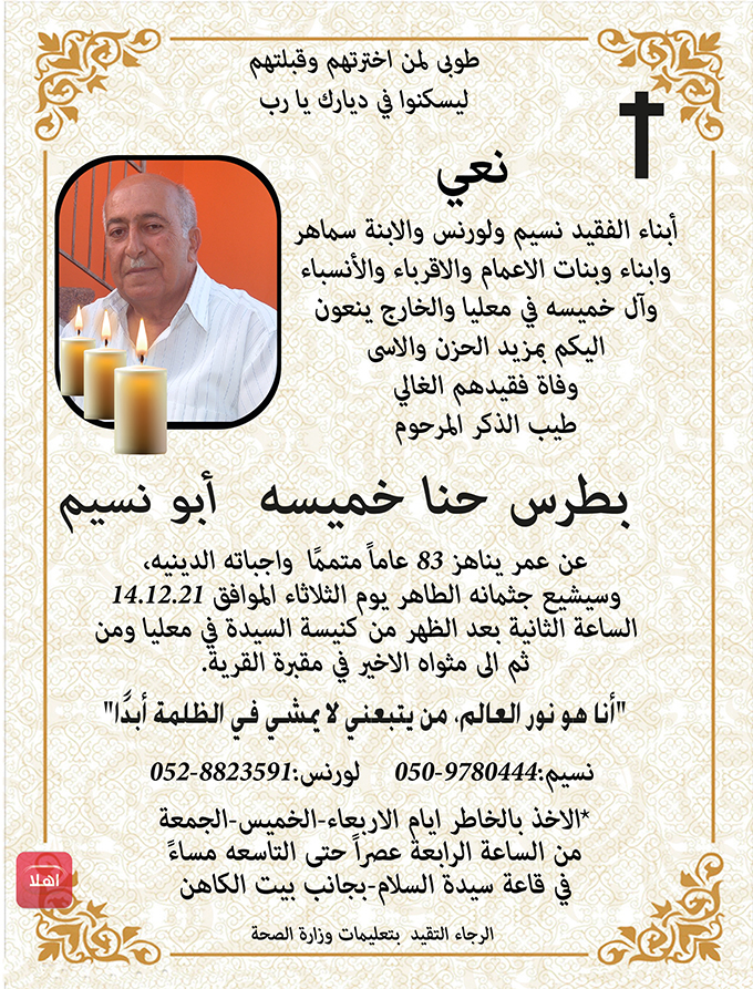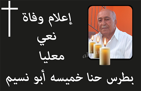 معليا:وفاة الفاضل بطرس حنا خميسه ابو نسيم