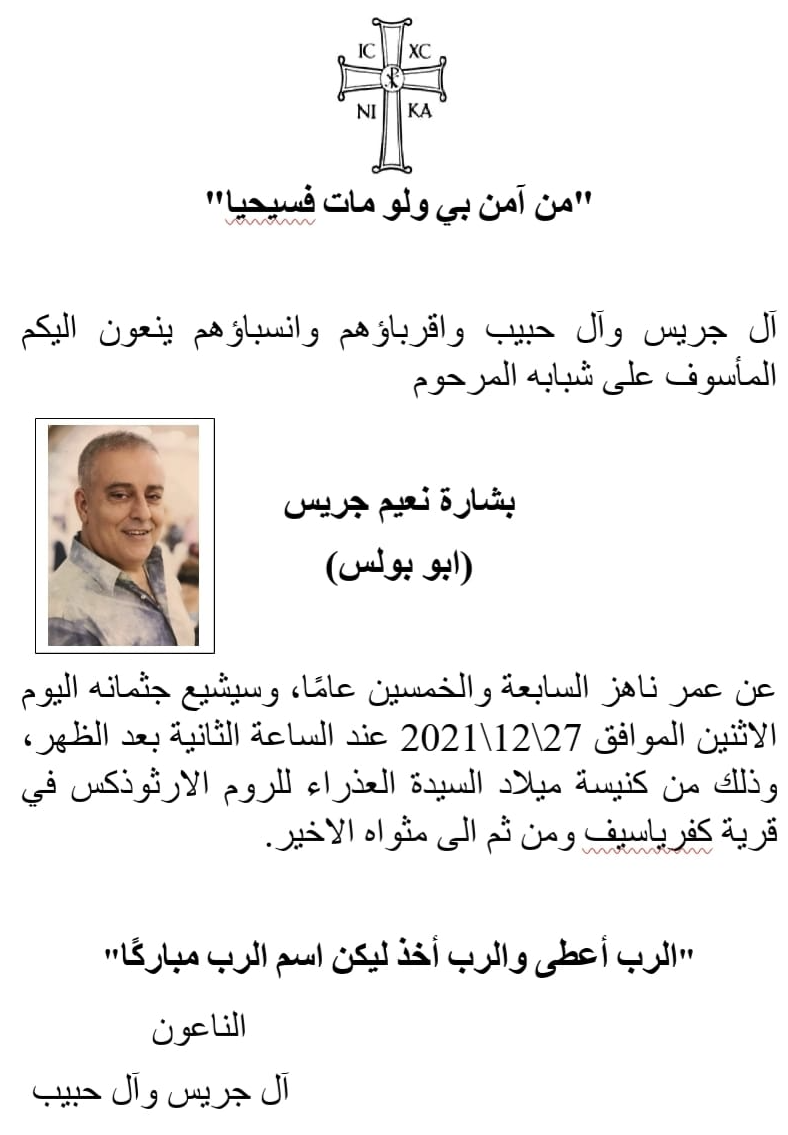 كفرياسيف: وفاة المأسوف على شبابة بشارة جريس