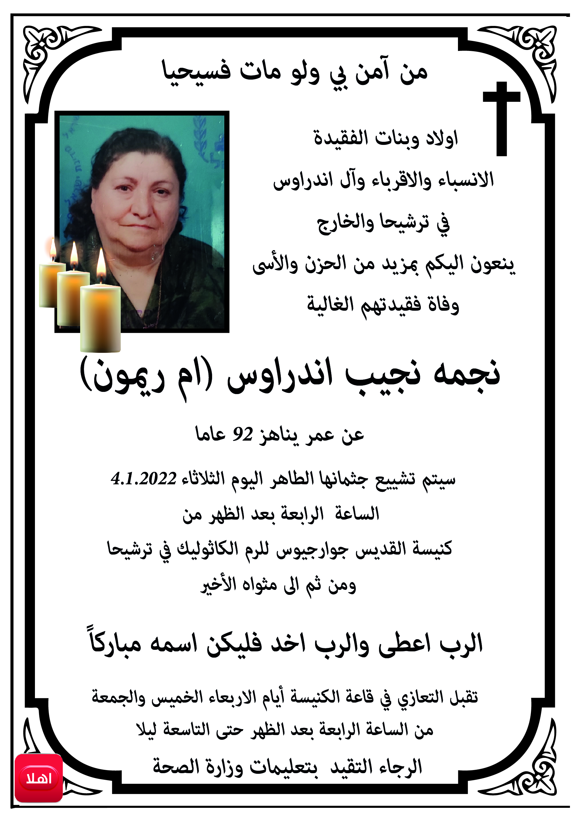 ترشيحا : وفاة الفاضله نجمه نجيب اندراوس ( ام ريمون) عن عمر يناعز 92 عاما