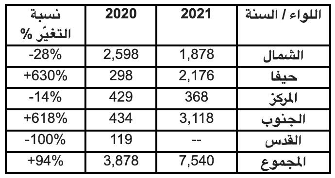 ويبين الجدول التالي التغير الذي طرأ على عدد قسائم البناء للسكن بين العامين 2021 و- 2020 في الألوية المختلفة: