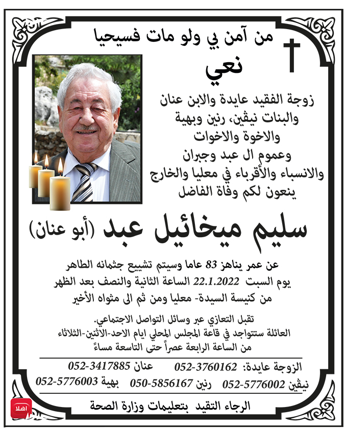 معليا: وفاة الفاضل ابو عنان سليم ميخائيل عبد