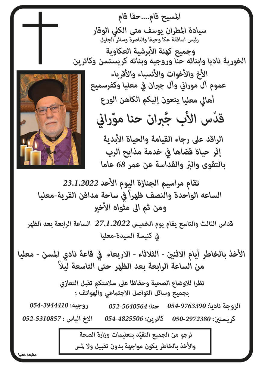 معليا: وفاة قدس الاب الكاهن جبران حنا موراني