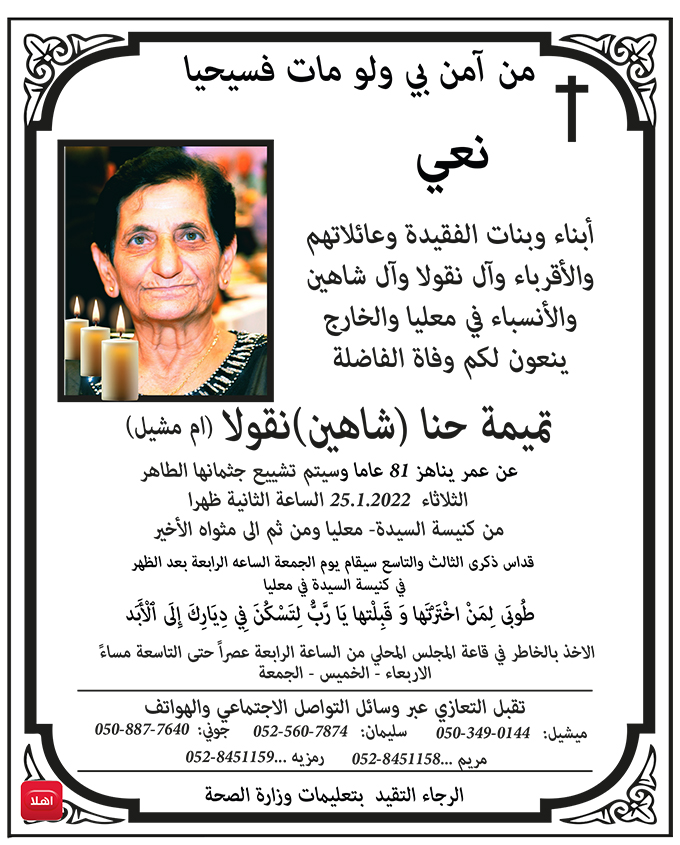 معليا- وفاة الفاضلة تميمة حنا شاهين نقولا - ام ميشيل