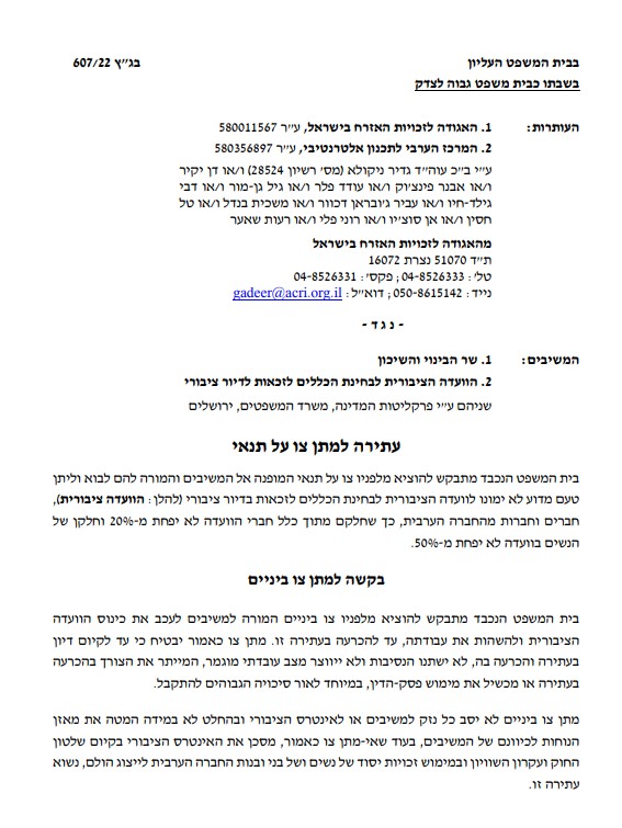 وفي الالتماس المرفوع اليوم، تطلب الجمعيّتان تعيين أعضاءٍ وعضواتٍ من المجتمع العربيّ في اللّجنة، بحيث لا تقلّ نسبتهم من مجمل أعضاء اللّجنة عن 20%، وبحيث لا تقلّ نسبة النّساء في اللّجنة عن 50%. كما يطالب الملتمسون إصدار أمرٍ مؤقّتٍ يقضي بتأجيل اجتماع اللّجنة العامّة، وتعليق عملها، إلى حين صدور قرارٍ بشأن الالتماس.
