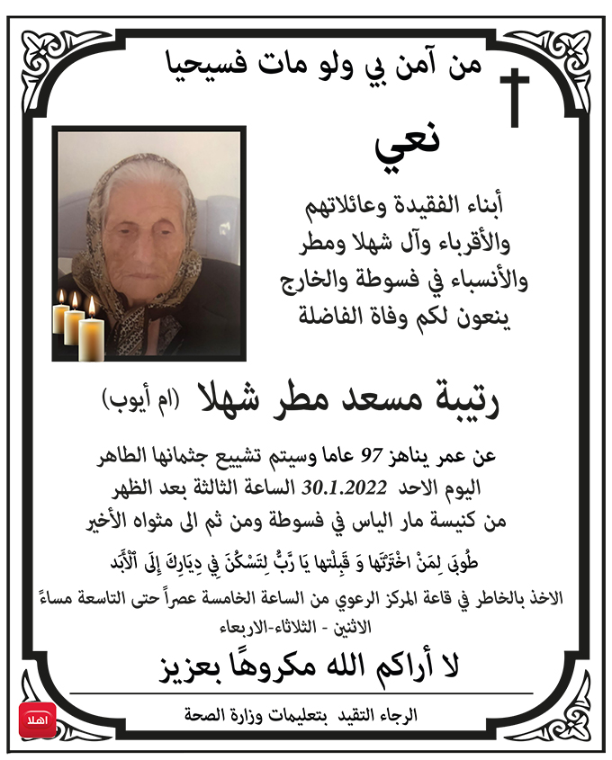 معليا- وفاة الفاضلة سهيلة الياس معلم - ام يعقوب