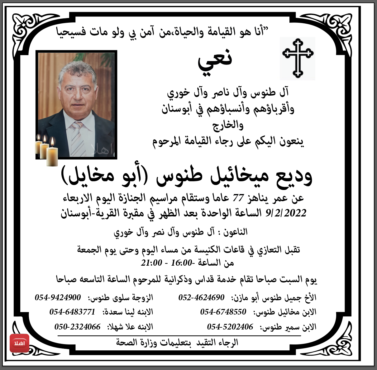ابو سنان: وفاة الفاضل وديع ميخائيل طنوس (أبو مخايل)