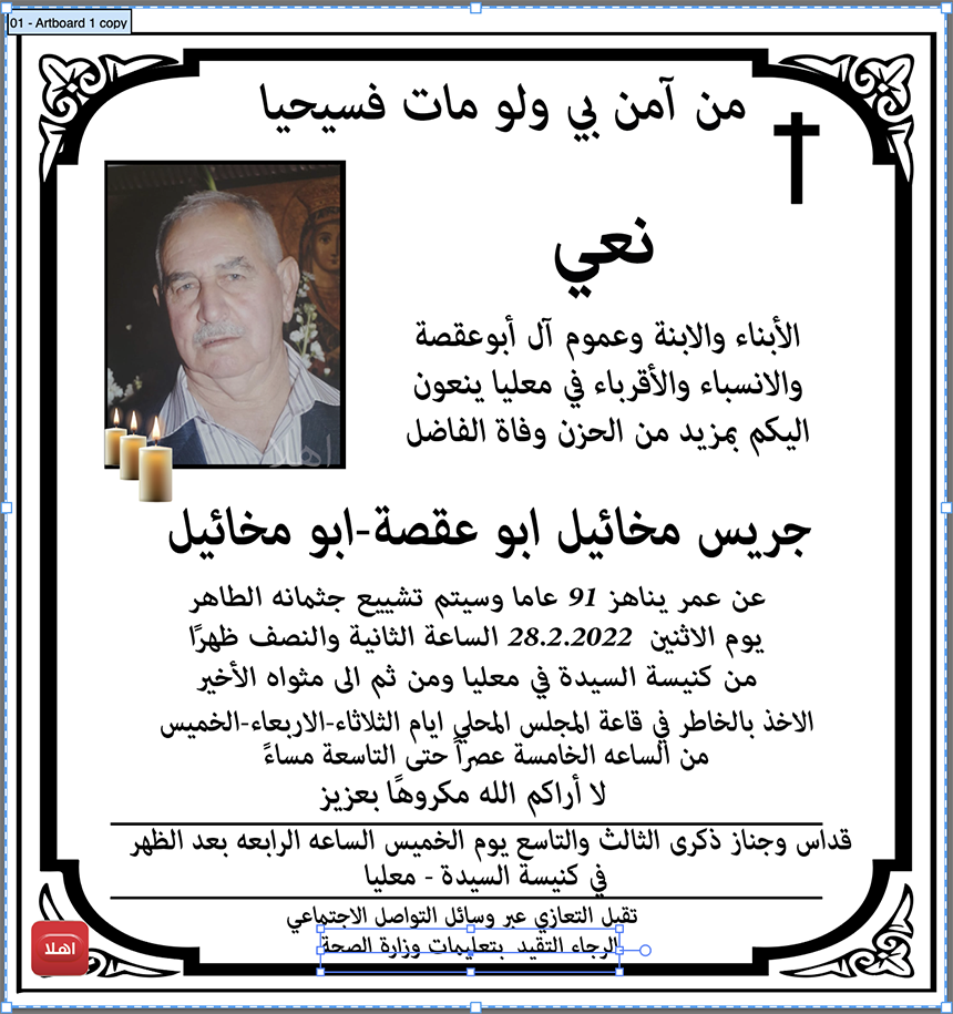 معليا: وفاة الفاضل جريس مخائيل ابوعقصة ابو مخائيل