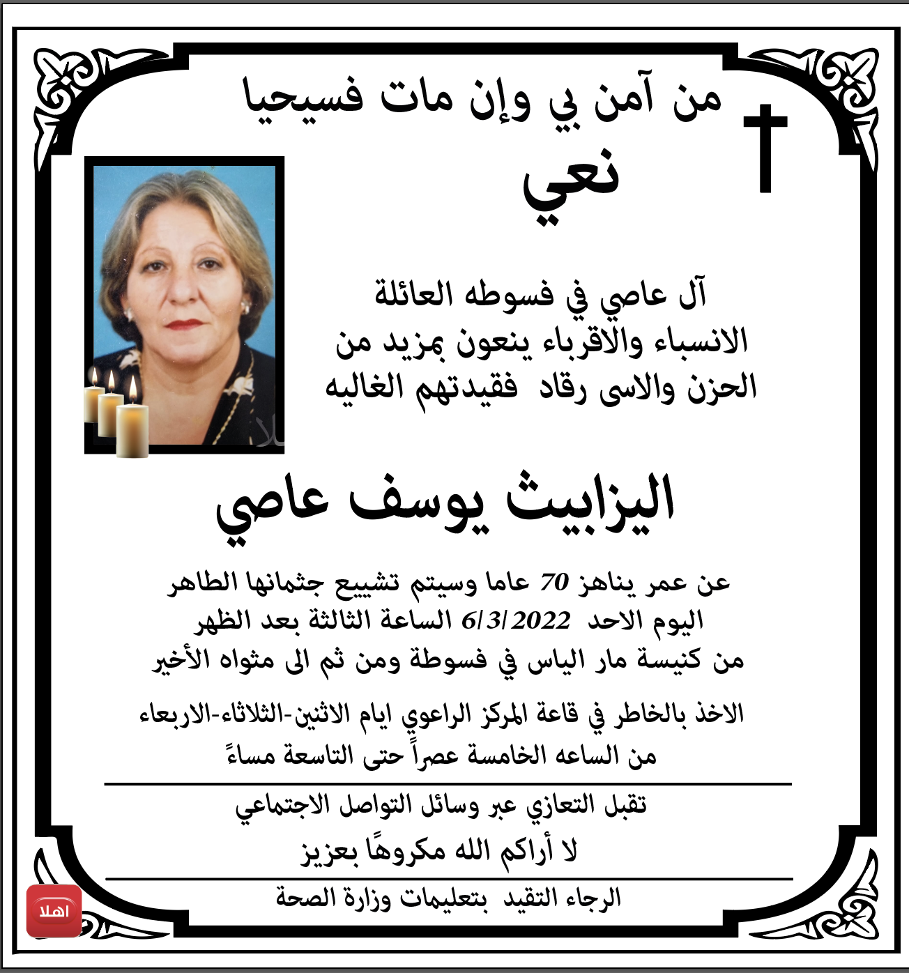 فسوطة: وفاة اليزابيث يوسف عاصي