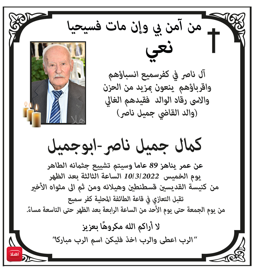 كفرسميع: وفاة الفاضل كمال جميل ناصر ابو جميل