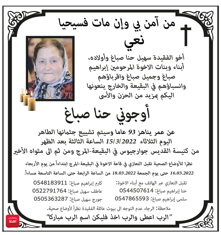 البقيعه-المرج: وفاة الفاضلة اوجوني حنا صباغ