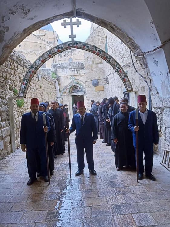 هذه عادة من العهد العثماني وهي ضمن الستاسيكو القانون الذي يعمل به منذ عام 1852 والذي يحفظ وينظم حقوق كل كنيسة في الكنائس المشتركة في الاراضي المقدسة وخصوصا في كنيسة القيامة. حيث كانت العادة ان يمشي رجال اشداء حاملين عصي يطرقون بها الارض ليفتح المارة الطريق امام موكب شخصية مهمة دينية او اجتماعية او سياسية.