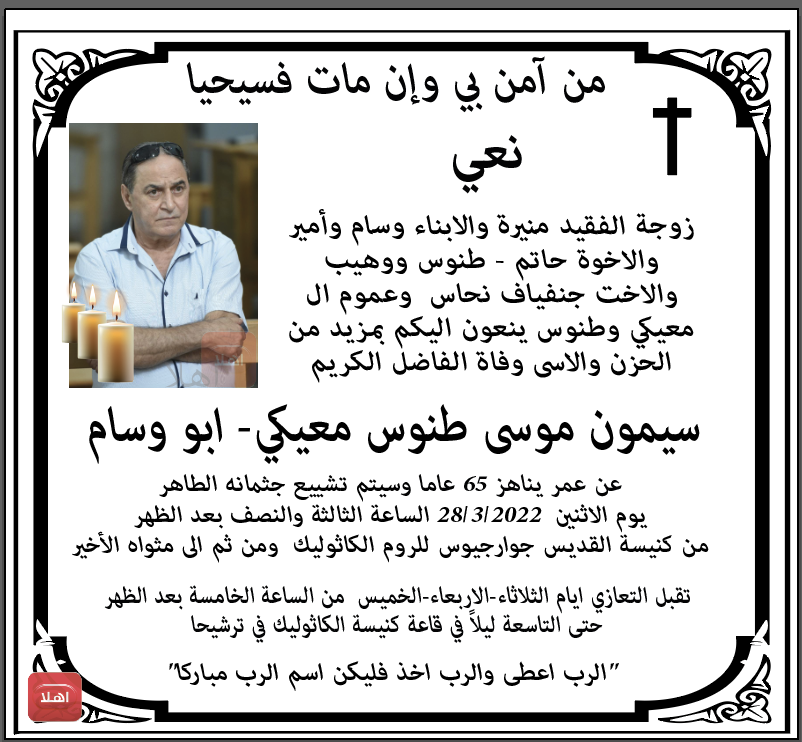 ترشيحا: وفاة الفاضل سيمون طنوس معيكي ابو وسام